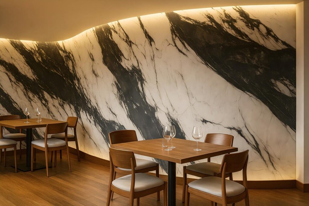 Rigid stone rewards perfect geometry and patient cutting. Curved walls, columns, and arches usually mean breaking panels into small pieces, repeated dry-fits, and mechanical anchors. Every extra step adds dust, noise, and opportunities for rework. Flexible stone takes a different path. Once the substrate is sound, clean, and within moisture tolerance, sheets are trimmed with a knife and bonded with the specified adhesive. The sheet conforms to the curvature, so the surface reads as one continuous finish instead of a patchwork of segments.