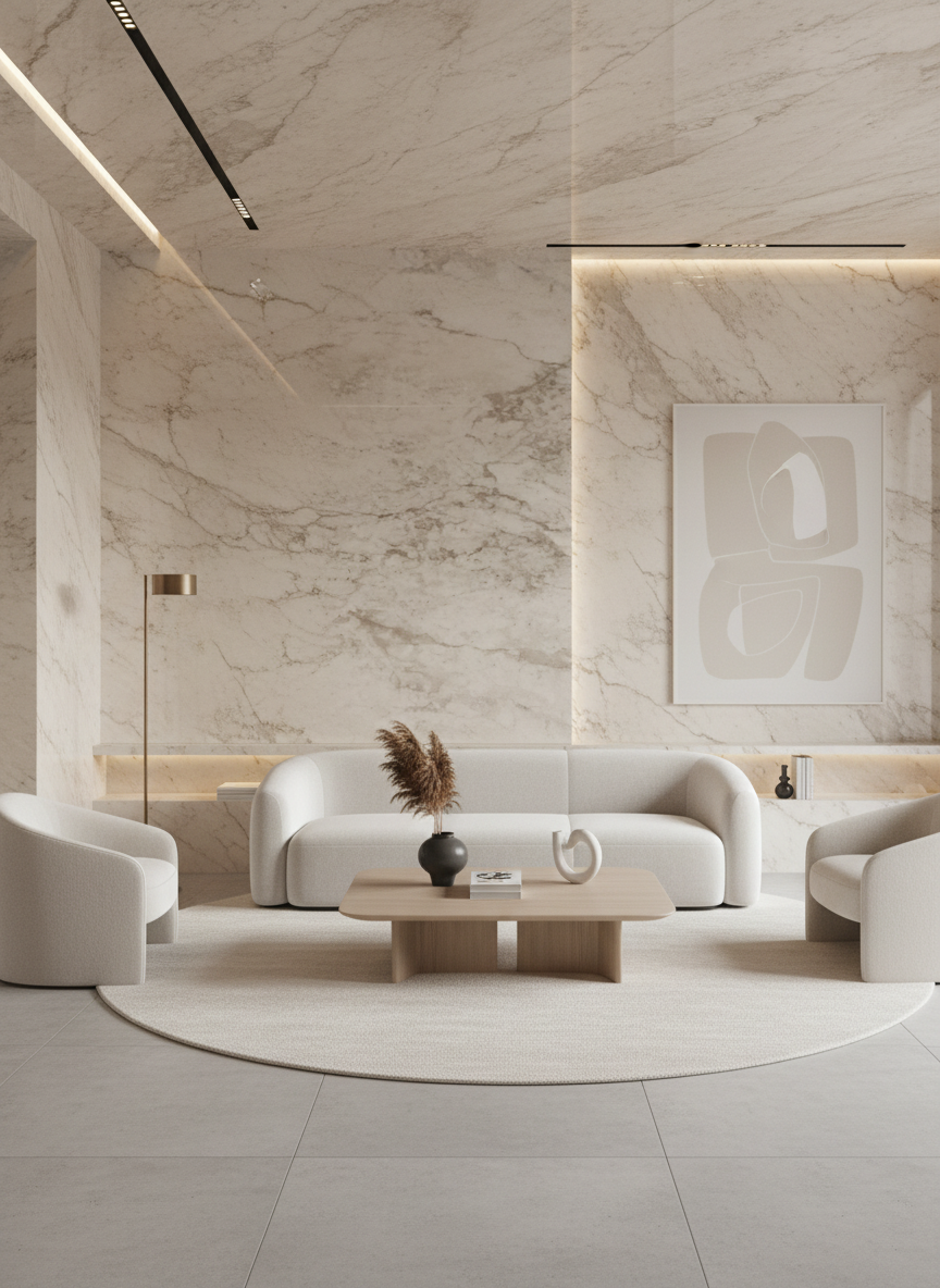 Cloud Travertine Series blends airy, cloud-like veining with classic travertine warmth, creating a calm, layered stone aesthetic. Soft matte surfaces diffuse light and highlight natural pores and movement. Perfect for living spaces, boutiques, and hotels, it pairs effortlessly with oak, linen, and brushed metals for serenity in modern minimalist interiors.