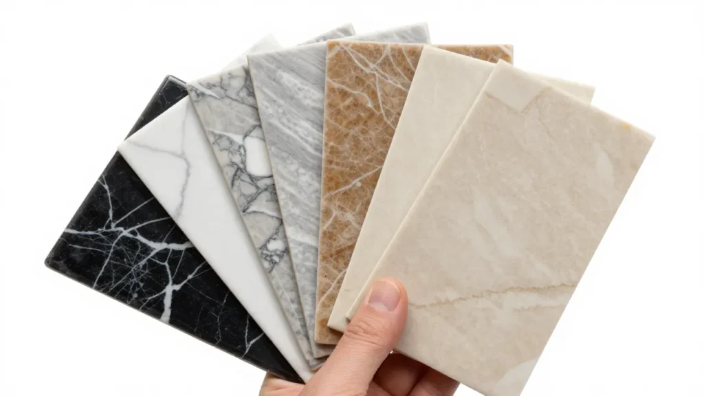 Popular looks include Calacatta-style white, Carrara-style grey, black marble, beige marble, and onyx-style patterns—available in high-gloss or matte finishes for TV walls, fireplaces surrounds (decorative zones), entry walls, and accent partitions.
