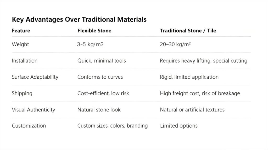 One of the most significant advantages of flexible stone is its exceptionally low weight. While traditional natural stone panels often weigh between 20 and 30 kilograms per square meter, flexible stone typically weighs only 3 to 5 kilograms per square meter. This drastic reduction in weight simplifies handling, cutting, and installation, allowing surfaces to be clad more efficiently. In practical experience, installation times can be cut nearly in half compared to conventional stone, reducing labor demands and minimizing project delays.